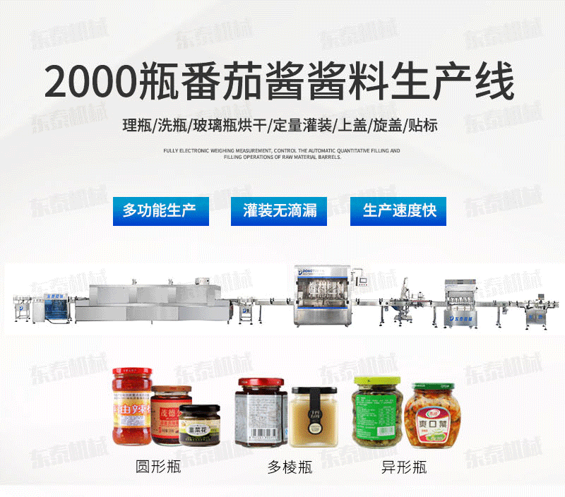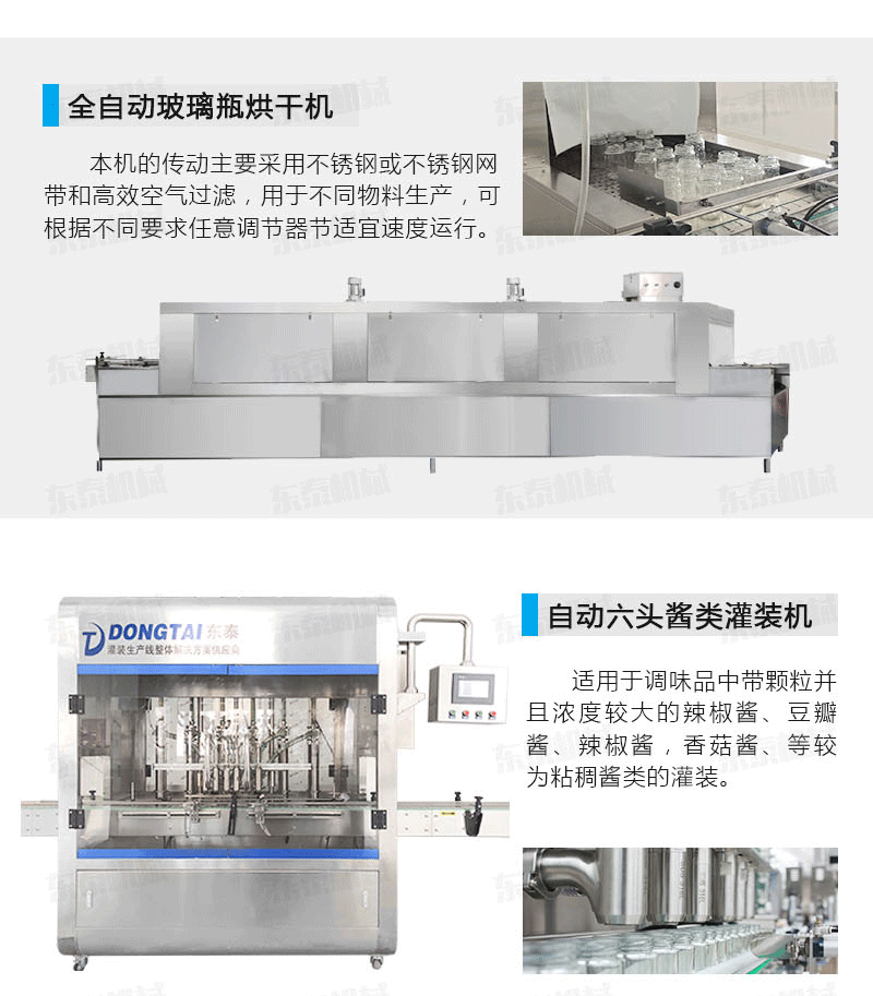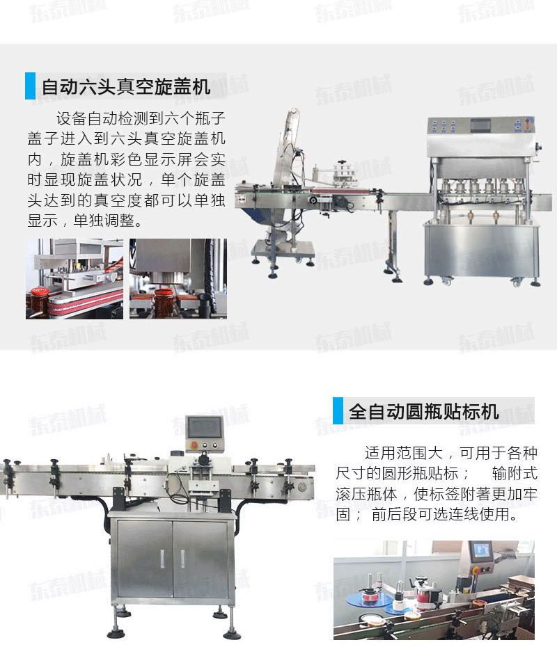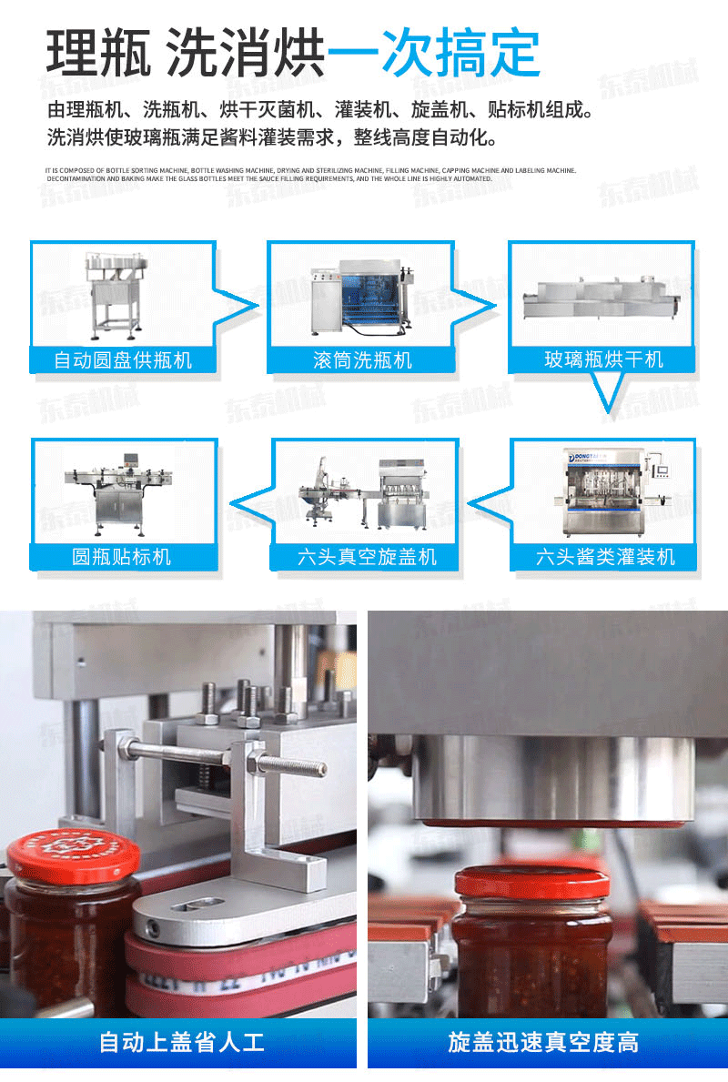 番茄醬灌裝旋蓋生產(chǎn)設備組成: 自動供瓶機+全自動滾筒洗瓶機+自動六米烘干機+自動收瓶機+全自動六頭灌裝機自動灌裝+全自動提蓋機自動理蓋、提蓋、掛蓋+六頭真空旋蓋機同時六個頭真空旋蓋+套標機+收縮