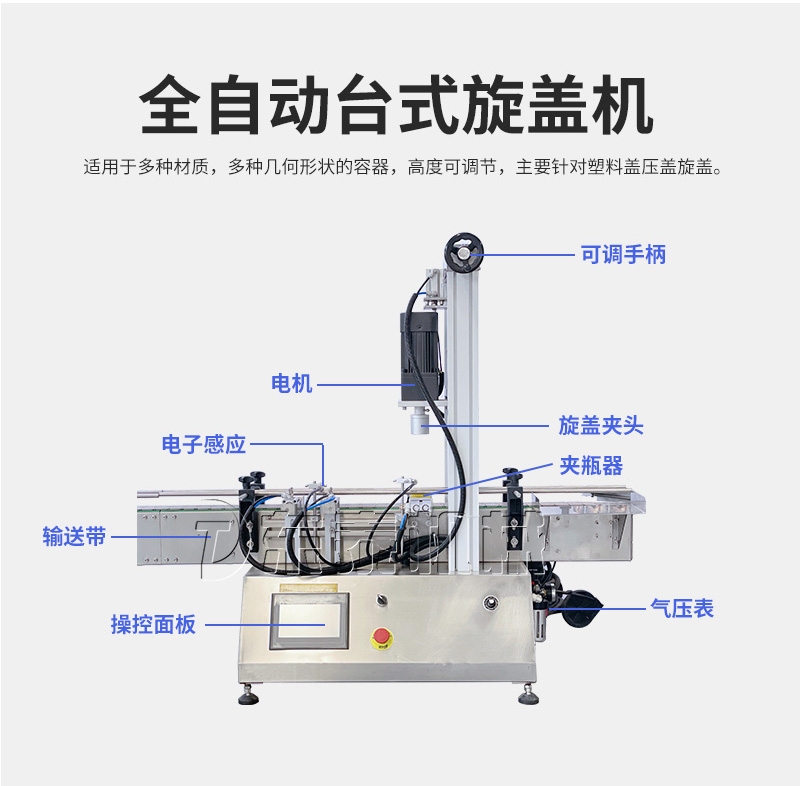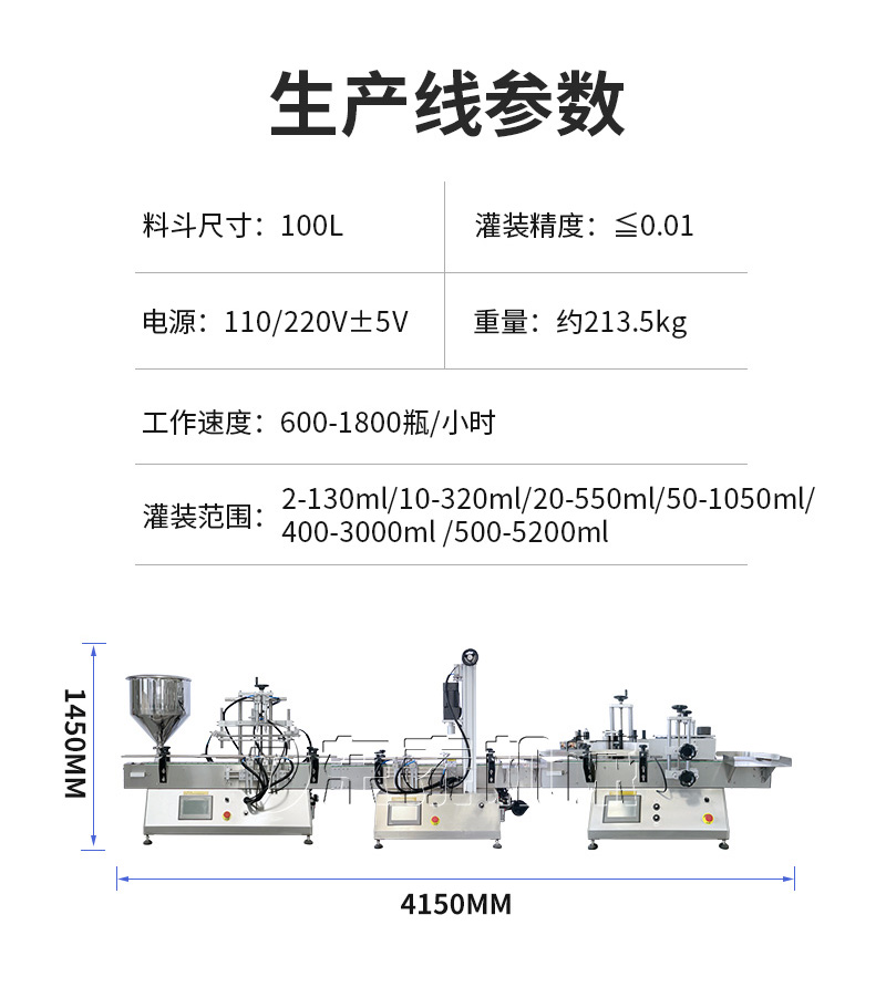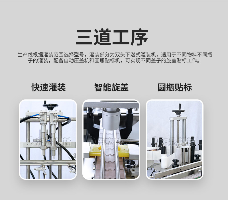 產(chǎn)品說明:生產(chǎn)線根據(jù)灌裝范圍選擇型號(hào),灌裝部分為雙頭下潛式灌裝機(jī),適用于不同物料不同瓶子的灌裝,配備自動(dòng)壓蓋機(jī)和圓瓶貼標(biāo)機(jī),可實(shí)現(xiàn)不同蓋子的旋蓋貼標(biāo)工作。