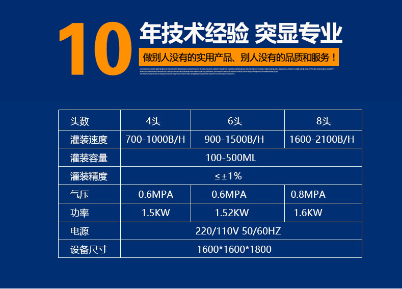 設(shè)備特點: 1、快速清洗、便于調(diào)整、容積缸體動作無極調(diào)速,適合不同規(guī)格、不同物料的灌裝。充填量一次調(diào)整完畢,每個容積缸體可分別微量調(diào)節(jié),灌裝精度高且一致性好。接觸物料的材料為316不銹鋼、硅橡膠、符合QS規(guī)范。 2、進(jìn)口減速電機(jī)無極調(diào)速控制灌裝柱塞缸,不僅適合各種膏體,亦適合醬料。 3、進(jìn)口電磁離合器和電磁制動器配合動作,消除慣性,灌裝精度高。 4、人機(jī)界面與PLC通訊,調(diào)試設(shè)備或更換品種只需在屏幕上設(shè)定。進(jìn)瓶、定位、灌裝充填、出瓶均自動作業(yè)。 5、灌裝時瓶子不到位、瓶子堵塞活出液管沒有插進(jìn)瓶子時設(shè)備將自動保護(hù),排除后繼續(xù)作業(yè)。